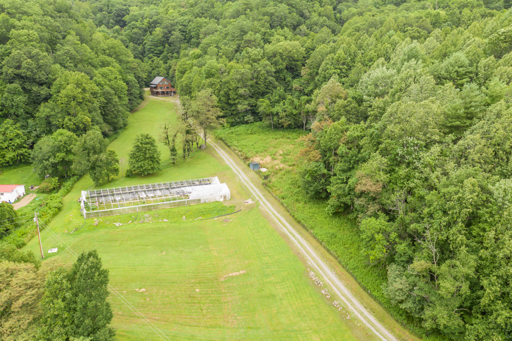 Located near the famous Max Patch mountain bald in the Spring Creek area of southern Madison County, it is easily accessible via a paved state maintained road with little traffic (that means it is quiet here). Of the 184 acres, there are approximately three acres of gently laying open fields including a large fenced animal corral area. The property fronts along Meadow Fork Branch which is a sizable year round stream and there is a secondary stream flowing from within the property itself that in the past provided irrigation for the 60′ x 120′ greenhouse (no flooding on this property). This stream can easily provide off-grid power via micro-hydro.