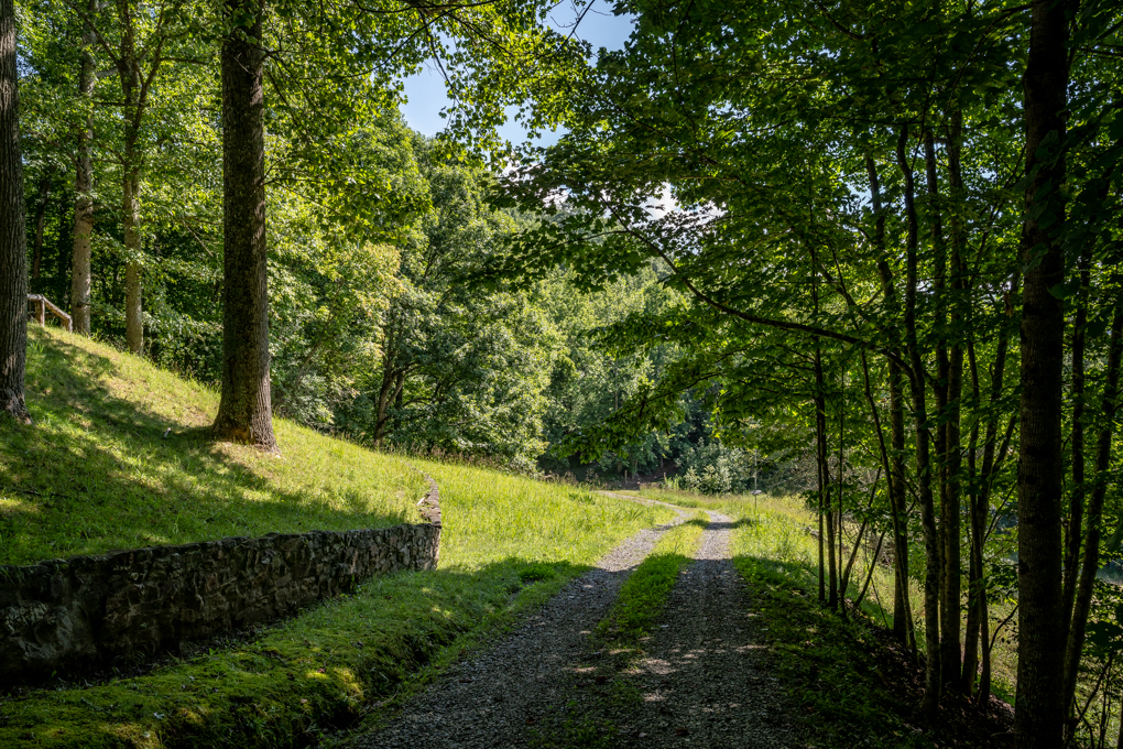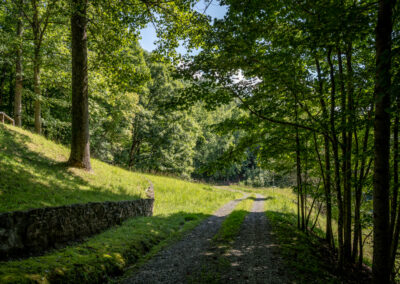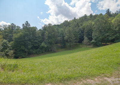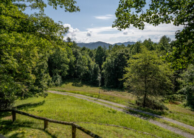 The land itself is generous in that it offers approximately two acres of gently laying open fields including a very small spring fed pond.  Yes, there is a spring that feeds the pond and flows through the six acres.  This area down below the house is ideal for gardening if one wishes to be self-sufficient.  In the other direction with a little tree trimming, there are views to the southwest and on most days you can hear the rapids of the French Broad River far below.